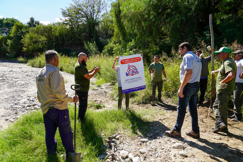 El Ministerio de Ambiente y Economía Circular realizó la colocación de cartelería para evitar la extracción ilegal de áridos del Arroyo Piedras Blancas, como parte de las acciones que se encuentran coordinando las provincias de Córdoba y San Luis para fortalecer el cuidado del arroyo que divide ambas provincias.